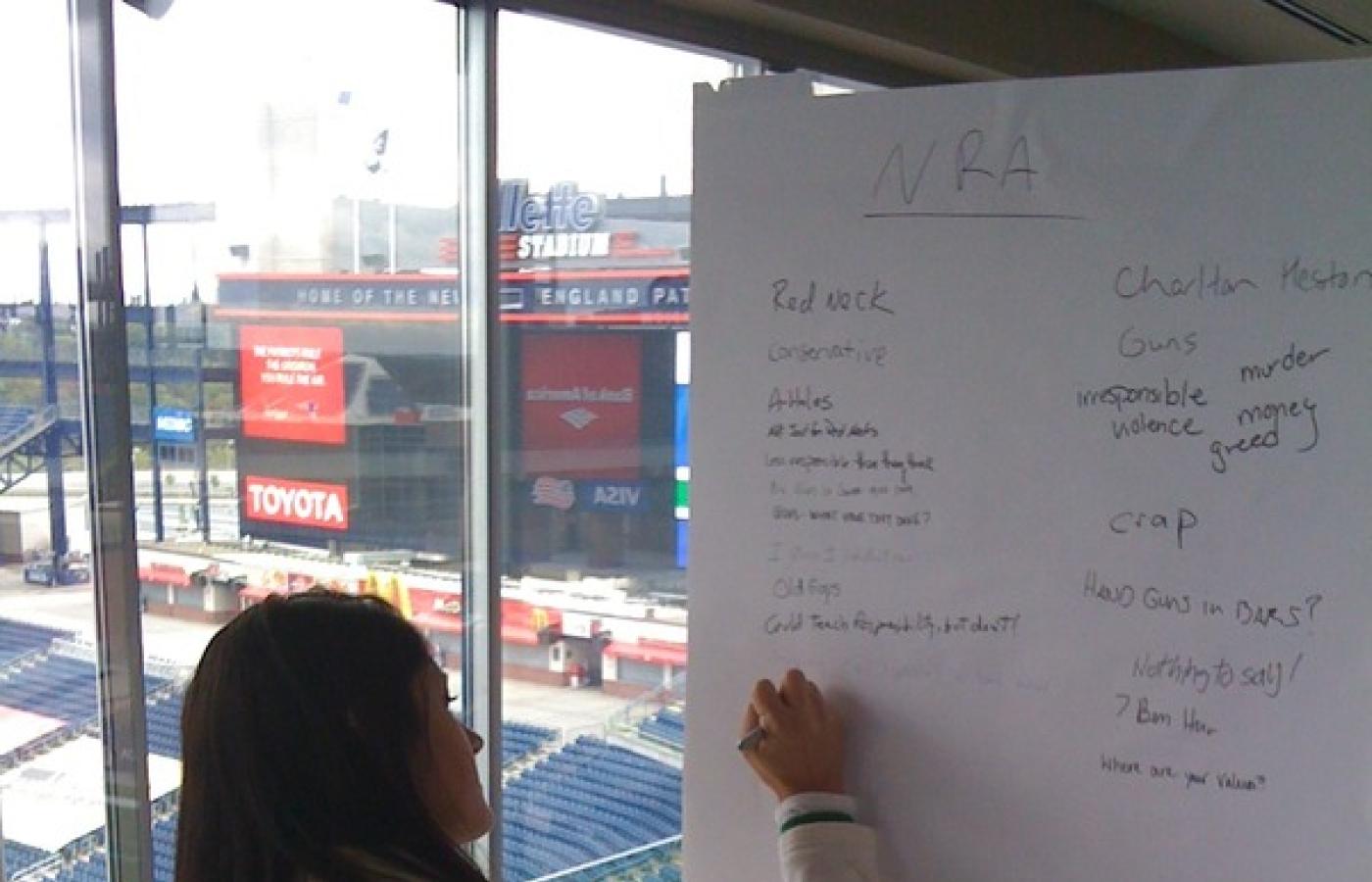 After going through a handful of slides and teeing up the idea of social media policy, I handed out a black Sharpie to about 40 people. Around the room were big pieces of paper taped to the walls with different well known brand names at the top - Nike, McDonald's, NRA, Barack Obama, etc. I asked each pen holder to take 5 minutes and write down whatever they wanted about each of the brands. People were excited to get out of their seats and do something different. There was a lot of chatter and discussion as people read what other people wrote. One attendee said "imagine that - we're actually talking at a social media conference!" As you can see from this image (thanks @sararanderson) , no one held back. I took the NRA example, read it to the room, held it up and said "You run the social media initiatives for the NRA.It's 8 am on a Monday morning and this is your Facebook page - What are you going to do about it?" We then had a short debate on how to handle negative and possibly brand damaging activity on the social web.